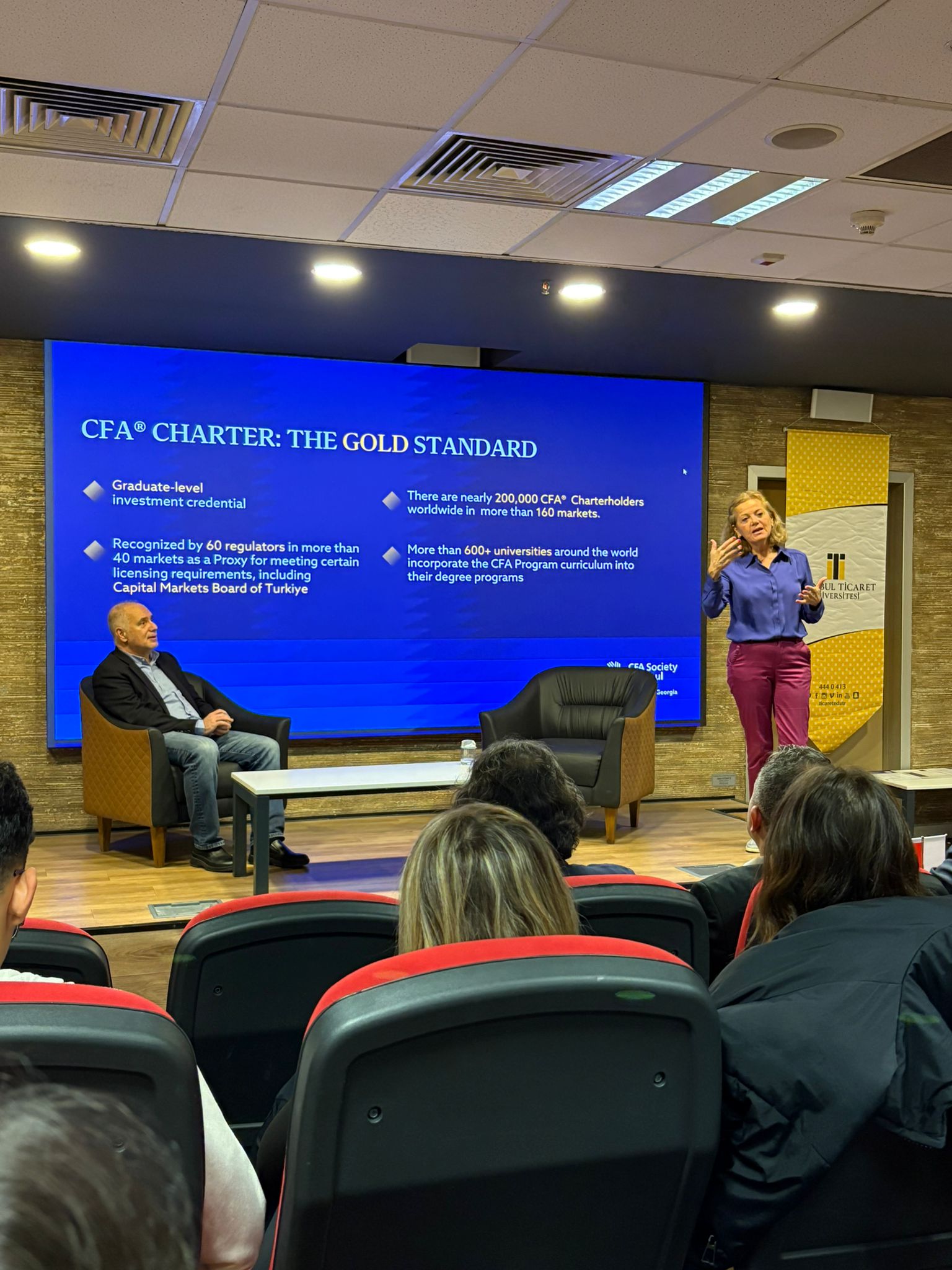 As in previous years, CFA Society visited our university, and İlke Homriş Takımoğlu, Emre Sezan, and Işıl Özbek were our guests. Brian Mandisozda, a graduate of our university’s Trade and Finance Institute who had previously taken and passed the CFA exams, shared his experiences with our students and offered advice regarding the exam.
