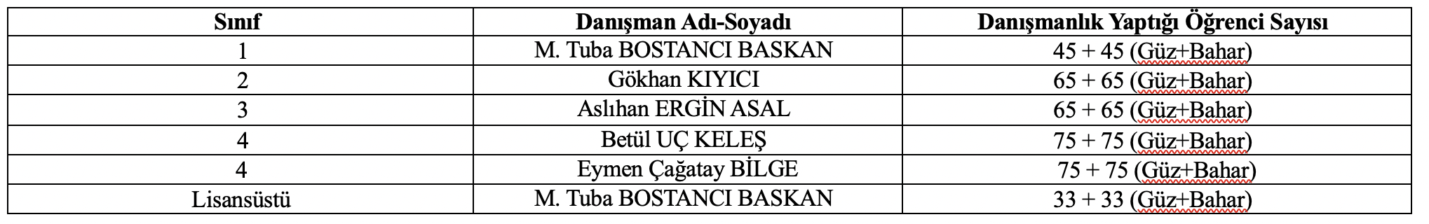 Akademik takvimde ilan edilen ders seçim haftasında öğrenciler dönem müfredatına göre derslerini sistem üzerinden seçerek ilgili danışmanına iletmektedir. Danışman, öğrencinin dönemi ve akademik geçmişini dikkate alarak onay veya ret vermektedir. Ders Ekleme-Bırakma Haftasında ise öğrencinin seçtiği dersler danışma tarafından incelenmekte ve eklemeye veya bırakma işlemleri yapılmaktadır. Öğrenci, dönem müfredatına göre derslerini yeniden seçip ya da bırakarak danışmanına iletmektedir. Danışmanın gönderdiği uyarı notuna göre öğrenci derslerini doğru bir şekilde tekrar düzenleyerek danışmanına göndermesi gerekmektedir. Son olarak, danışman öğrencinin dönem bilgileri ve akademik geçmişini değerlendirerek ekleme ve bırakma işlemlerini onaylamakta ve süreç tamamlanmaktadır. 2024-2025 Eğitim Öğretim yılında İç Mimarlık ve Çevre Tasarımı Bölümü Türkçe Programı’nda danışmanlık yapan öğretim kadromuzun bilgisi ve danışmanlık yaptığı öğrenci sayıları aşağıda gösterilmiştir.