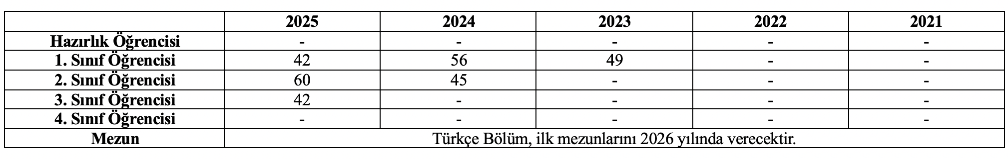 İç Mimarlık ve Çevre Tasarımı Türkçe programda son beş yıla ait hazırlık sınıfı öğrencisi, 1. sınıf öğrencisi, 2. sınıf öğrencisi, 3. sınıf öğrencisi, 4. sınıf öğrencisi ve programdan mezun olan öğrenci sayıları tabloda verilmiştir.