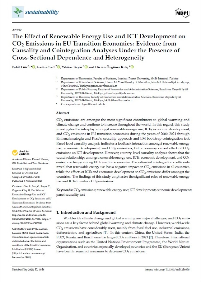 İktisat Bölümü öğretim üyemiz Prof. Dr. Betül GÜR’ün de yazarları arasında yer aldığı “The Effect of Renewable Energy Use and ICT Development on CO₂ Emissions in EU Transition Economies: Evidence from Causality and Cointegration Analyses Under the Presence of Cross-Sectional Dependence and Heterogeneity” başlıklı çalışma, Web of Science (WOS) kapsamında SSCI indeksinde taranan Sustainability (2025, Cilt 17, Sayı 21) dergisinde yayımlandı.
