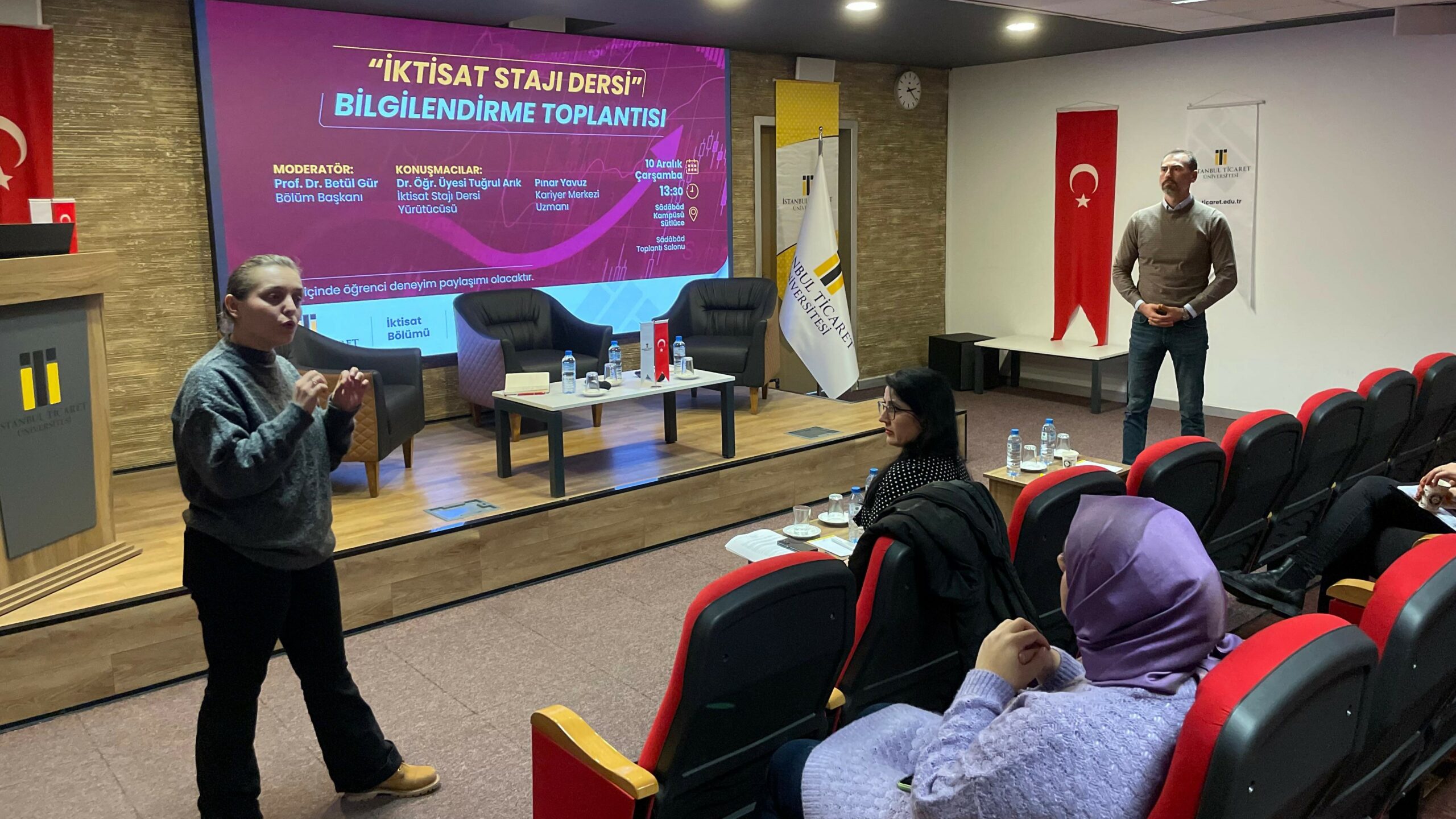 İktisat Bölümü tarafından bölüm öğrencilerinin staj süreçleri hakkında bilgilendirilmesi ve kariyer planlamalarının desteklenmesi amacıyla düzenlenen İktisat Stajı Dersi Bilgilendirme Toplantısı, 10 Aralık 2025 tarihinde Sâdâbâd Kampüsü Sâdâbâd Toplantı Salonu’nda gerçekleştirildi.