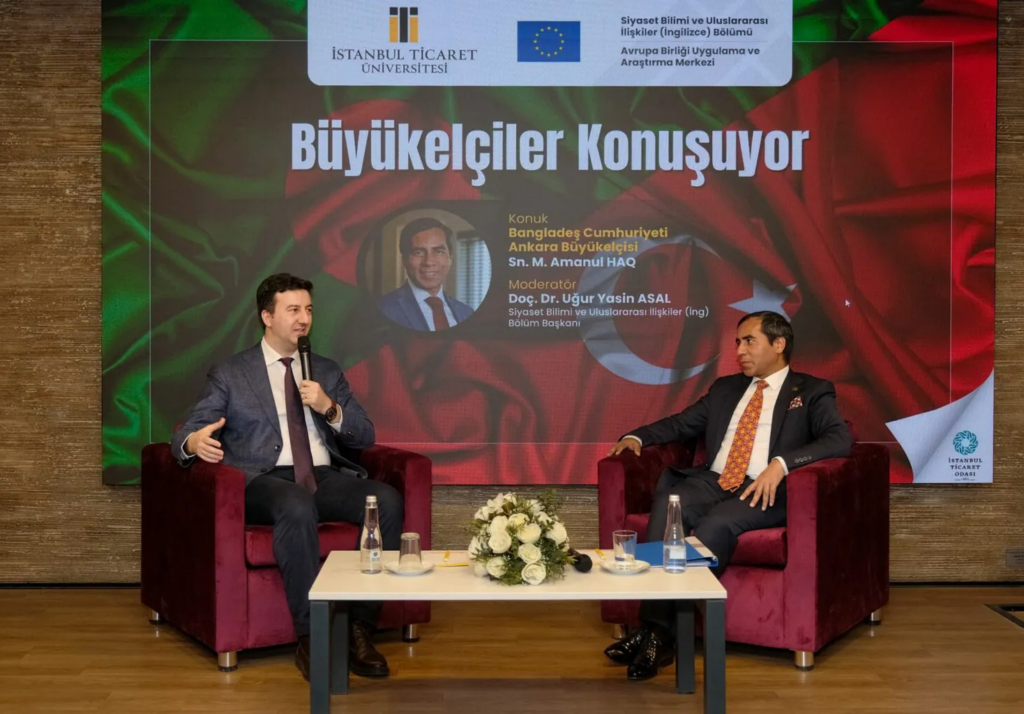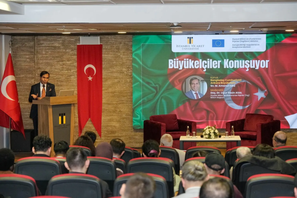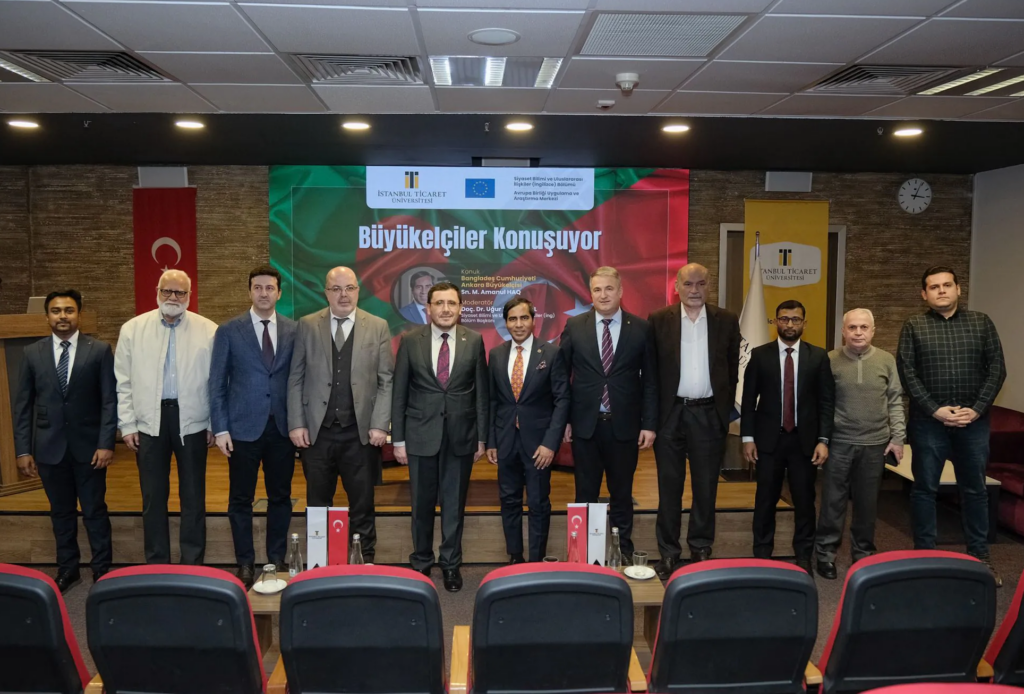 İstanbul Ticaret Üniversitesi Avrupa Birliği Uygulama ve Araştırma Merkezimiz tarafından düzenlenen “Büyükelçiler Konuşuyor” programında, Bangladeş Cumhuriyeti Ankara Büyükelçisi M. Amanul HAQ öğrencilerimizle buluştu. Sâdâbâd Kampüsü Sütlüce Sâdâbâd Toplantı Salonu’nda gerçekleştirilen program, Siyaset Bilimi ve Uluslararası İlişkiler (İngilizce) Bölüm Başkanımız Doç. Dr. Uğur Yasin Asal’ın moderatörlüğünde yapıldı. Etkinliğe; Rektörümüz Prof. Dr. Necip Şimşek, Yükseköğretim Kurulu (YÖK) Üyesi Prof. Dr. Erol Arcaklıoğlu, Rektör Yardımcımız Prof. Dr. Hanifi Parlar, İnsan ve Toplum Bilimleri Fakültesi Dekanımız Prof. Dr. Ahmet Kavas, Emekli Büyükelçi AHM Moniruzzaman ile Büyükelçilik yetkilileri ve öğrenciler katıldı.
