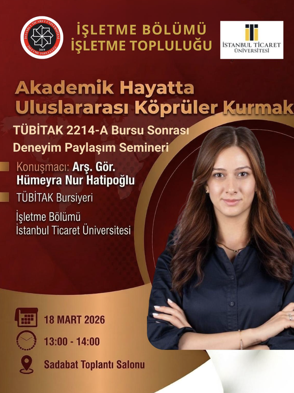 İstanbul Ticaret Üniversitesi İşletme Bölümü ve İşletme Topluluğu iş birliğiyle düzenlenen “Akademik Hayatta Uluslararası Köprüler Kurmak” başlıklı seminer gerçekleştirildi. TÜBİTAK 2214-A bursiyeri Arş. Gör. Hümeyra Nur Hatipoğlu’nun konuşmacı olduğu etkinlikte, yurtdışı akademik deneyimler ve burs süreci öğrencilere aktarıldı.