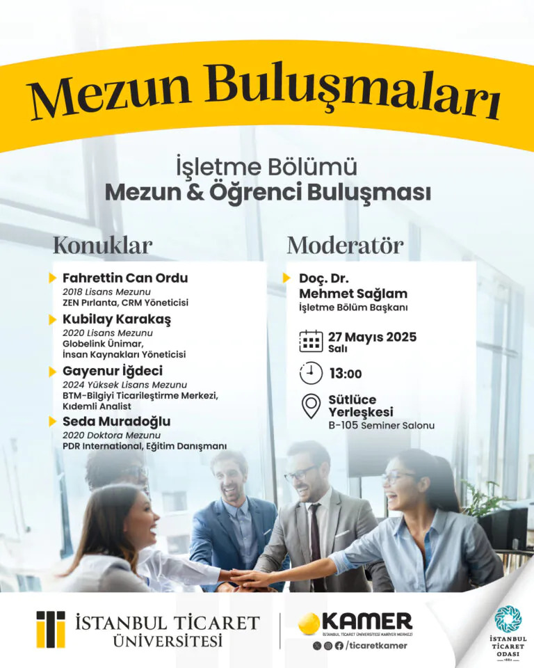 İstanbul Ticaret Üniversitesi İşletme Bölümü, Kariyer Merkezi (KAMER) iş birliğiyle 27 Mayıs 2025 Salı günü Sütlüce Yerleşkesi’nde “Mezun Buluşmaları” etkinliğini düzenledi. İşletme Bölüm Başkanı Doç. Dr. Mehmet Sağlam’ın moderatörlüğünü üstlendiği programda, farklı dönemlerde mezun olan isimler öğrencilerle bir araya gelerek iş dünyasındaki tecrübelerini aktardı.