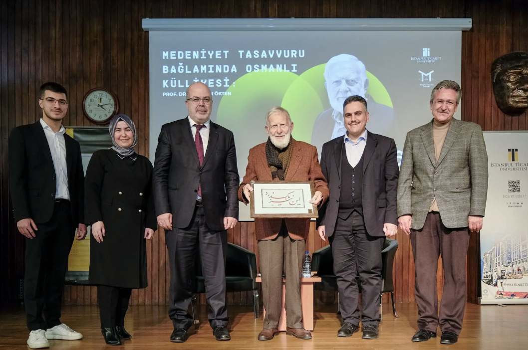 İstanbul Ticaret Üniversitesi Mimarlık ve Tasarım Topluluğu tarafından düzenlenen “Medeniyet Tasavvuru Bağlamında Osmanlı Külliyesi” başlıklı program, Hezarfen Kampüsü Küçükyalı Konferans Salonu’nda gerçekleştirildi. Cumhurbaşkanlığı Milli Saraylar Bilim ve Değerlendirme Kurulu Başkanı Prof. Dr. Sadettin Ökten’in konuşmacı olarak yer aldığı etkinlik, Mimarlık ve Tasarım Fakültesi öğretim üyesi Dr. Öğr. Üyesi Murat Erdal Dere’nin moderatörlüğünde yapıldı. Programa Rektör Yardımcılarımız Prof. Dr. Hanifi Parlar ile Prof. Dr. Berk Ayvaz, Meslek Yüksekokulu Müdürümüz Doç. Dr. Muhammet Ceylan, Mimarlık ve Tasarım Fakültesi Dekan Yardımcımız Dr. Öğr. Üyesi Sacide Akın ile bölüm başkanları, akademisyenler ve öğrenciler katıldı.