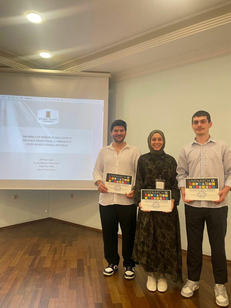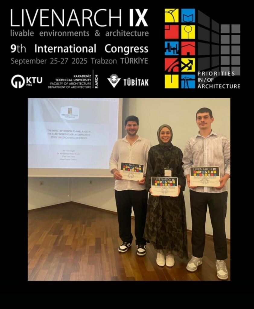 Mimarlık Bölümü Öğretim Görevlisi Dr. Nur Sümeyye Yalçın Koçak danışmanlığında yürütülen “The Impact of Window-to-Wall Ratio in the Early Design Stage: A Comparative Study on Educational Buildings” başlıklı çalışma, 25-27 Eylül 2025 tarihlerinde Karadeniz Teknik Üniversitesi ev sahipliğinde düzenlenen 9. Uluslararası LivenARCH Kongresi’nde sunuldu.