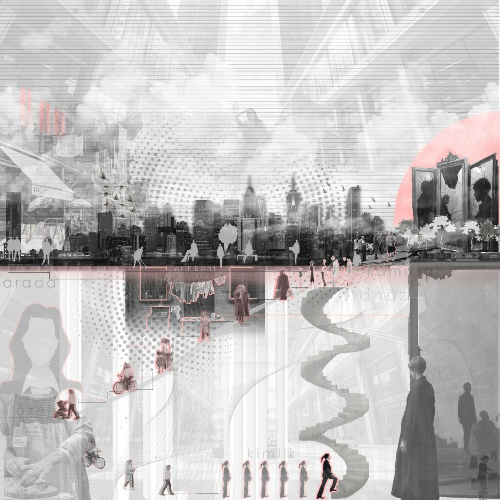 Çalışmada kullanılan dijital kolaj, maskeleme, tipografi entegrasyonu ve renk geçişleri, kadın emeğinin kamusal alandaki silikleşmesini katmanlı bir biçimde ifade ederken, aynı zamanda kentin tek tipleştirici kimlik dayatmasına eleştirel bir bakış sunuyor. Öğrencinin açıklamasında belirtildiği üzere, gri tonlar kentin erilliğini, pembe tonlar ise kadına atfedilen rollerin içsel mekânını temsil ederek “arada” olma hâlini güçlendiriyor.