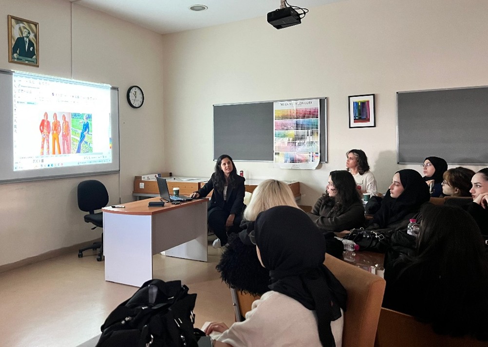 Tekstil ve Moda Tasarımı Bölümü Moda Trend Analizi dersi kapsamında, 01 Aralık 2025 tarihinde Tekstil ve Hazır Giyim Tasarımcısı Esin Çelenk konuk edildi. Türkiye, Avrupa ve Amerika’da çeşitli markalara danışmanlık yapan Çelenk, 25 yıllık tecrübenin ardından kurduğu kendi markası “esindesign” girişimini öğrencilerle paylaştı.